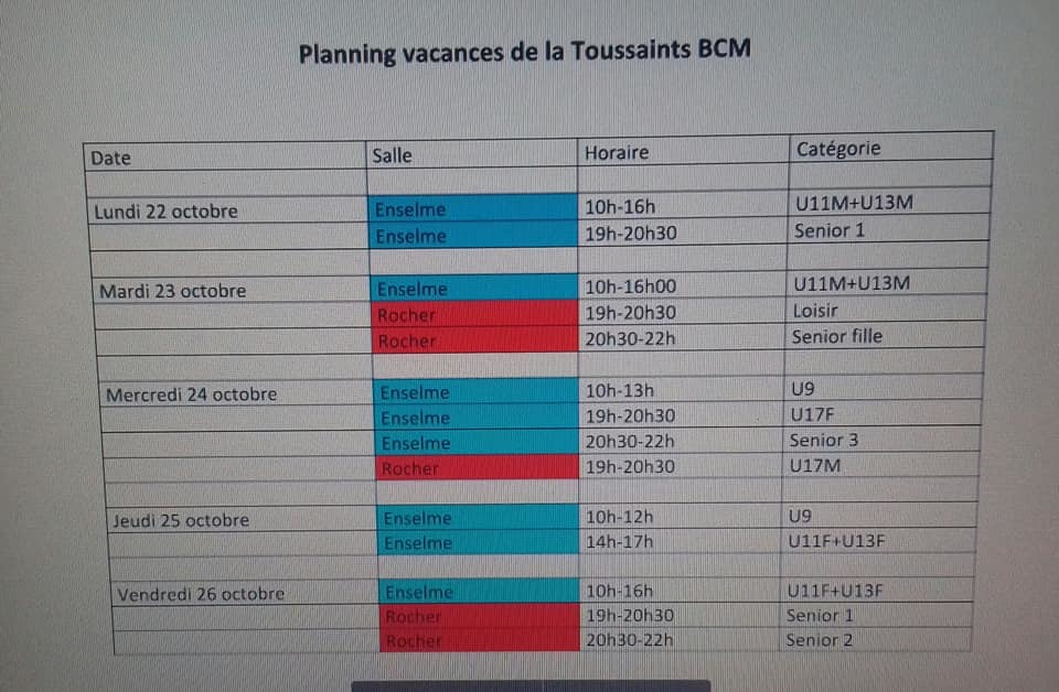 Entrainements des vacances de la TOUSSAINT - Semaine du 22 au 26/10/2018