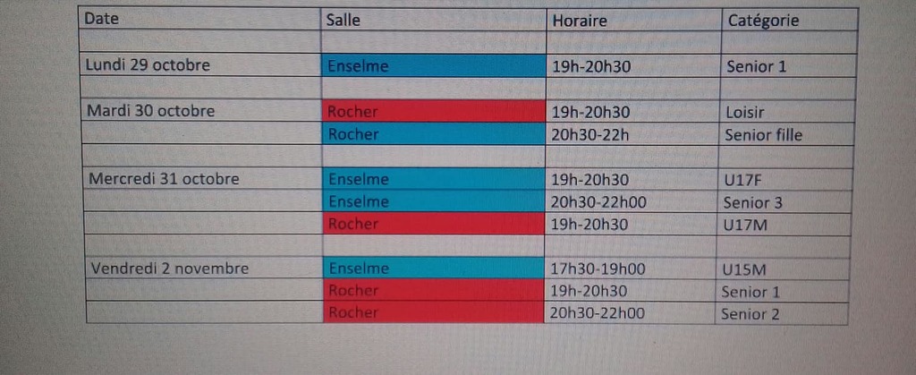 Entrainements des vacances de la TOUSSAINT - Semaine du 29/10 au 02/11/2018